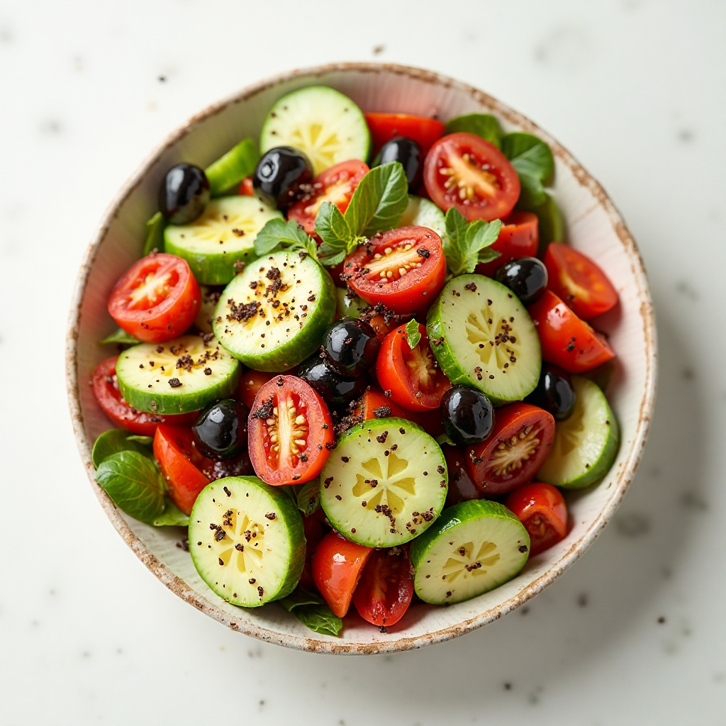 - En un tazón grande, coloca los tomates cherry, las aceitunas negras y el pepino cortado en cubos.