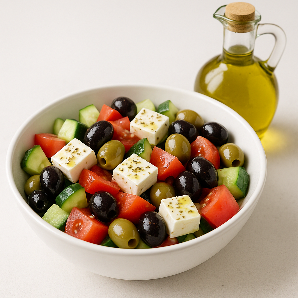 La ensalada griega es un clásico de la cocina mediterránea, conocida por su frescura y sabor intenso. Esta versión utiliza aceite de oliva virgen extra, un ingrediente esencial para realzar el sabor y aportar sus múltiples beneficios para la salud. Es perfecta como acompañamiento o incluso como plato principal para aquellos días en los que buscas algo ligero y saludable.