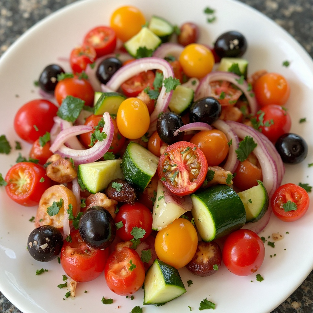 Esta ensalada es rica en antioxidantes gracias a los tomates y pimientos, y proporciona grasas saludables gracias al aceite de oliva. Es una opción ligera pero llena de sabor que puede ser disfrutada como plato principal o como acompañamiento en cualquier comida.