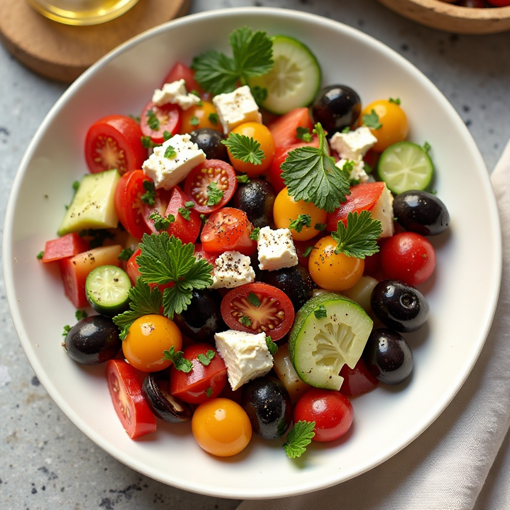Esta ensalada es rica en antioxidantes y fibra gracias a los vegetales frescos y las aceitunas. El aceite de oliva virgen extra proporciona beneficios para el corazón y los niveles de colesterol. Para una versión más ligera, puedes reducir la cantidad de queso feta o prescindir de él por completo.