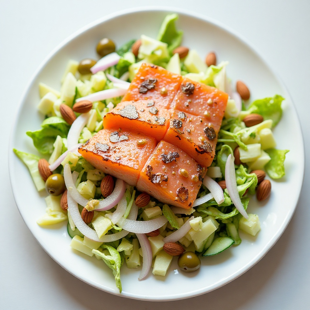 - En otro bol, coloca la lechuga, el pepino, la cebolla roja, las aceitunas y las almendras. Agrega el aderezo previamente preparado y mezcla hasta que todos los ingredientes estén bien cubiertos.