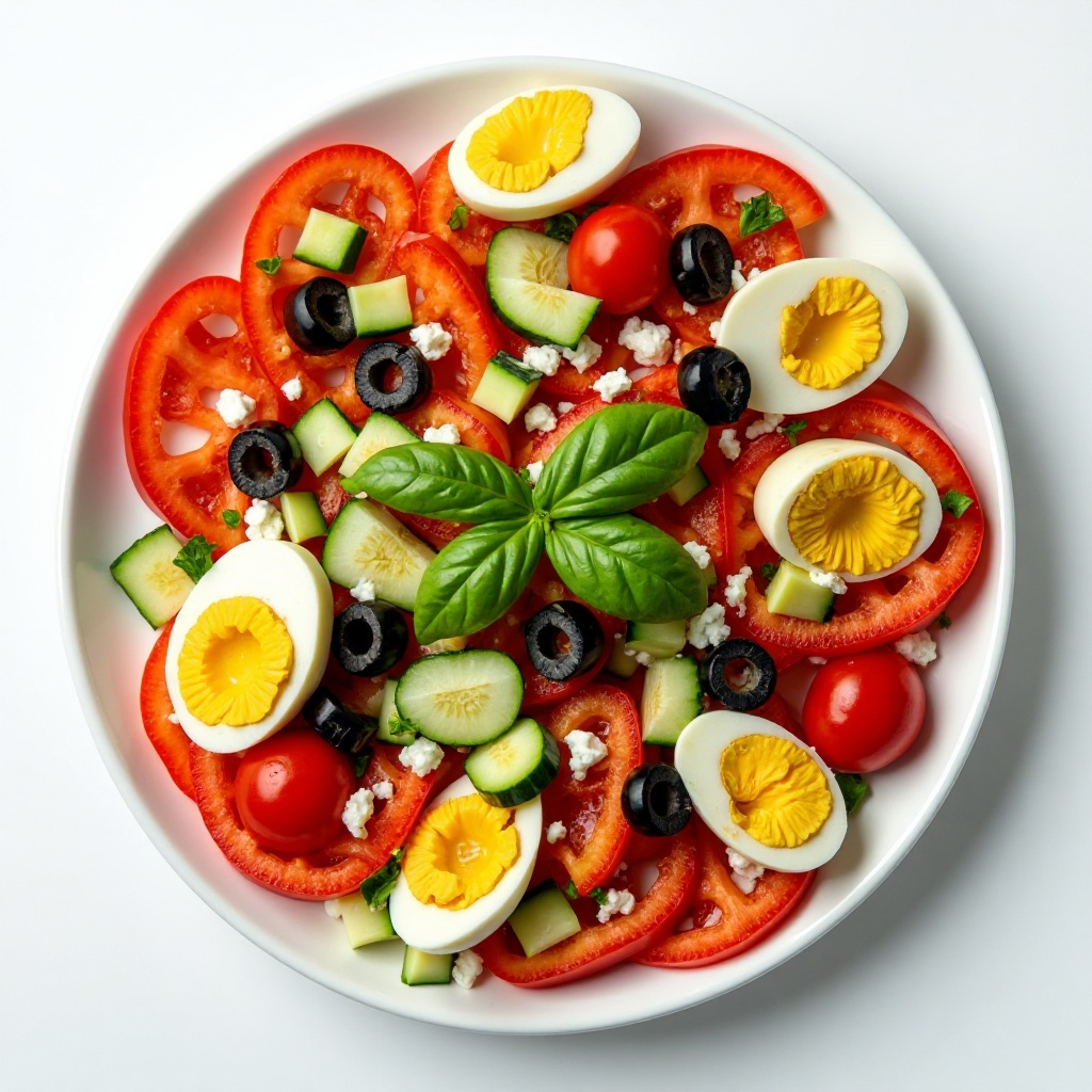 - En un tazón grande, coloca el pimiento rojo, los tomates cherry, los huevos, el pepino y las aceitunas. Agrega la albahaca fresca picada.