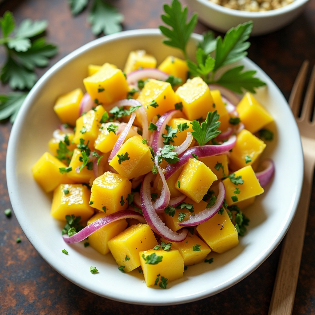 La Ensalada Tropical de Maracuyá y Mango es un plato vibrante y lleno de sabor, inspirado en la rica tradición culinaria de Kiribati, específicamente en Tarawa. Este plato es perfecto para disfrutar de un festín tropical, utilizando frutas exóticas como el maracuyá, conocido por su intenso sabor cítrico, y el mango, que ofrece dulzura equilibrada. Ideal para una cena refrescante o un almuerzo ligero.