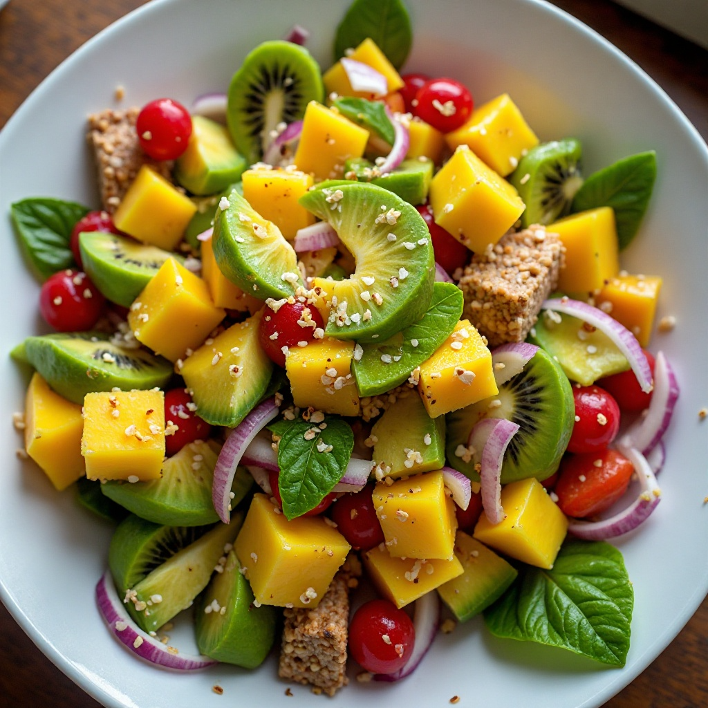 Esta ensalada es rica en vitaminas y antioxidantes gracias a las frutas tropicales, como el mango y la piña, que proporcionan un alto contenido de vitamina C. El aguacate aporta grasas saludables. Adapta la sal y pimienta según tus preferencias dietéticas.