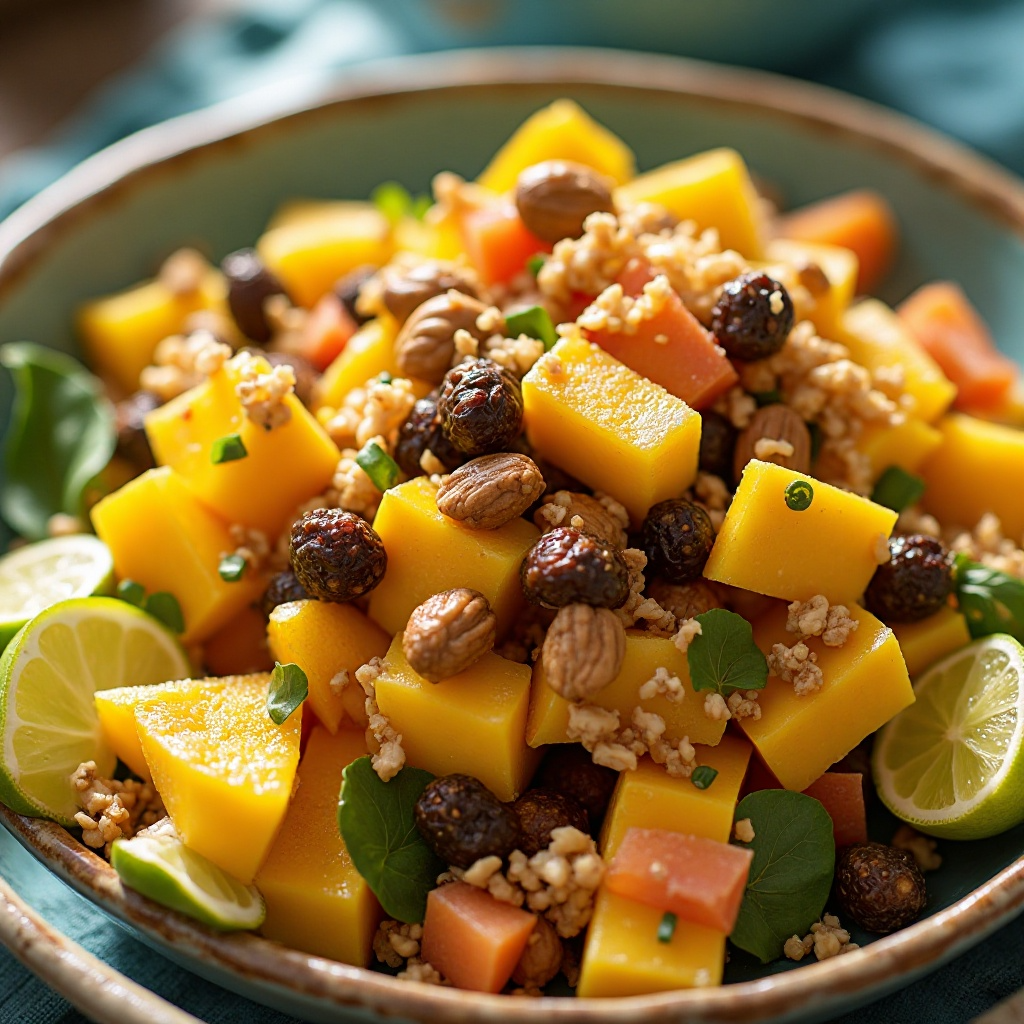 Esta ensalada es rica en vitaminas y antioxidantes gracias a las frutas tropicales. El mango, la papaya y las uvas pasas son fuentes naturales de vitamina C, mientras que los cacahuates aportan grasas saludables y proteínas. Si buscas una opción sin gluten, asegúrate de verificar si los cacahuates están procesados con gluten o contienen aditivos procesados.