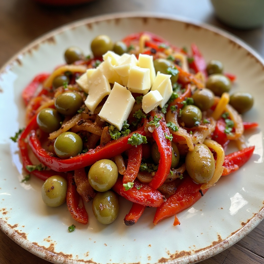 4. En un tazón, mezcla las tiras de cebolla y pimientos con las aceitunas. Añade el aceite de oliva y vinagre balsámico al gusto, sal y pimienta para ajustar el sabor.
