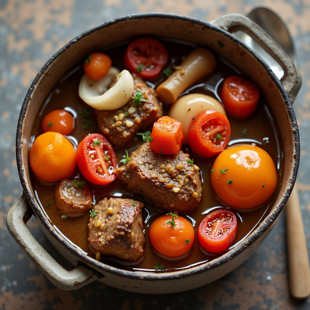 5. Vierte el caldo de verduras y lleva a ebullición. Reduce el fuego a bajo, tapa la olla y cocina a fuego lento durante 1-1,5 horas, hasta que la carne esté tierna y el estofado tenga una consistencia rica.