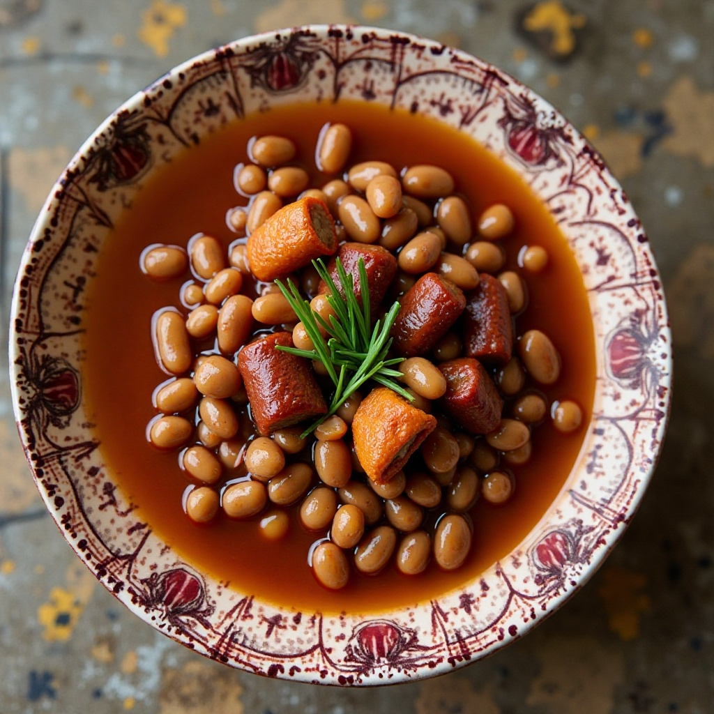 - Sirve la fabada en platos hondos, asegurando que cada porción tenga un trozo de morcilla, chorizo y lacón. Decorar con hojas de cebollino fresco.