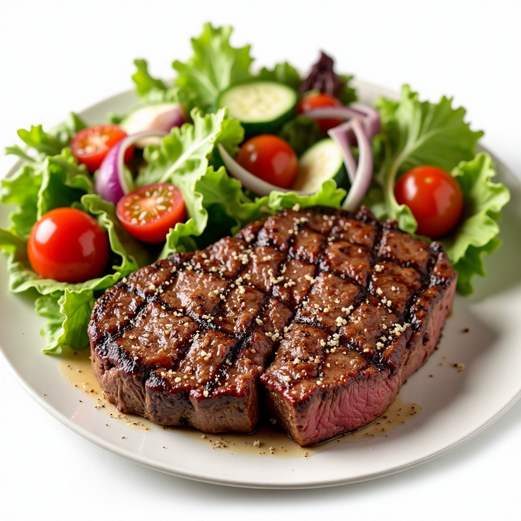 La carne de Filet Mignon es una fuente rica en proteínas magras, ideal para dietas saludables. Asegúrate de cocinar la carne hasta que alcance una temperatura interna segura (160°F/71°C) para prevenir cualquier riesgo de contaminación cruzada. La ensalada proporciona vitaminas y antioxidantes beneficiosos.