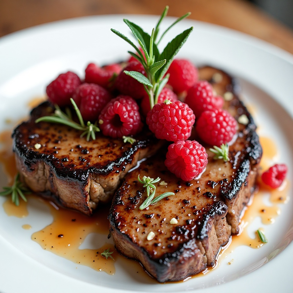 - En una sartén aparte, calienta el aceite y rehoga las frambuesas con un toque de romero hasta que estén suaves y caramelizadas.