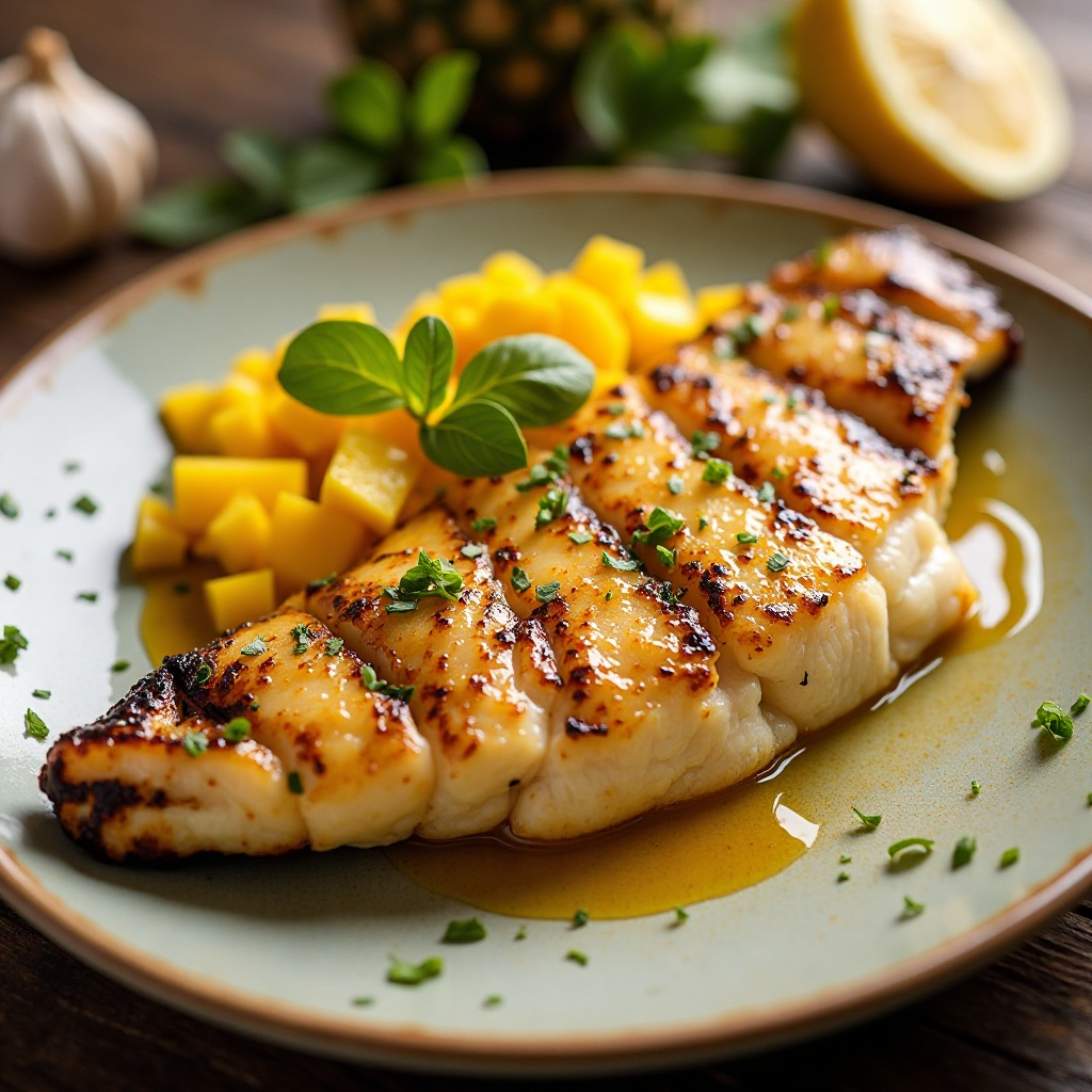 - Mientras los filetes están cocinando, en un sartén a fuego bajo, calienta una cucharada de aceite de oliva. Agrega los cubos de mango y piña, y cocina durante unos minutos para que los sabores se mezclen, sin quemar la fruta. Agrega el jugo de limón al final y revuelve para crear la salsa de mango.