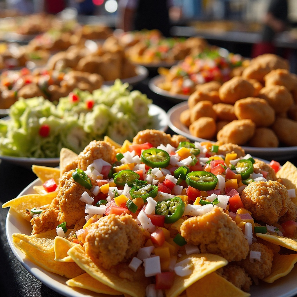 La variedad es clave en este buffet simulado. Los nachos pueden ser altos en calorías y grasas saturadas, pero un toque de verduras puede ayudar a equilibrar esto. El pollo frito, aunque sabroso, es alto en colesterol; asegurarse de consumirlo con moderación es importante. Las ensaladas y los arroces son opciones más saludables, destacando por sus nutrientes y bajo contenido en grasas.