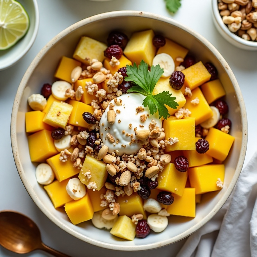 Este bowl es una excelente fuente de vitaminas C y potasio, gracias a las frutas tropicales. Las nueces aportan grasas saludables y proteínas, mientras que la crema agria o el yogur griego añade un toque de textura cremosa sin mucho contenido de grasa. Para ajustar la receta a tus necesidades dietéticas, puedes optar por alternativas más ligeras, como leche descremada en lugar de crema agria.
