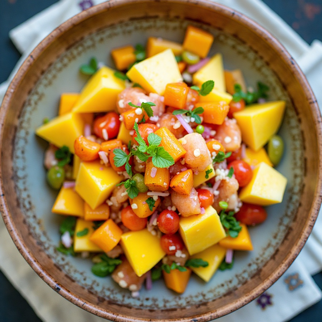 Esta ensalada es un manjar de nutrientes, rica en vitaminas C y antioxidantes gracias a las frutas tropicales. Las frutas proporcionan fibra esencial para el sistema digestivo y son bajas en calorías, ideales para una dieta equilibrada. El jugo de limón y naranja añade un toque ácido que puede ayudar a la digestión.