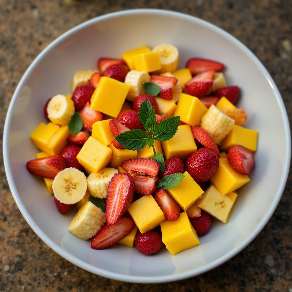 1. En un tazón grande, coloca todos los ingredientes frescos: mangos, papaya, fresas y bananas. Mezcla suavemente para combinarlos.