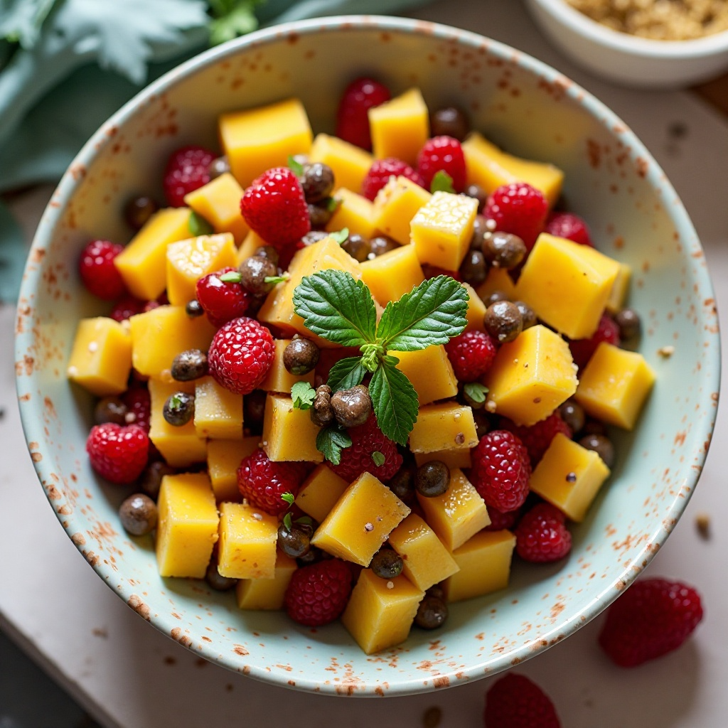 Este plato es una delicia saludable, rico en vitaminas y antioxidantes gracias a las frutas tropicales. La miel o sirope de agave no solo añade dulzura sino que también aporta propiedades antimicrobianas. Si prefieres evitar el azúcar añadido, puedes experimentar con jugo de limón y endulzante natural como la stevia.