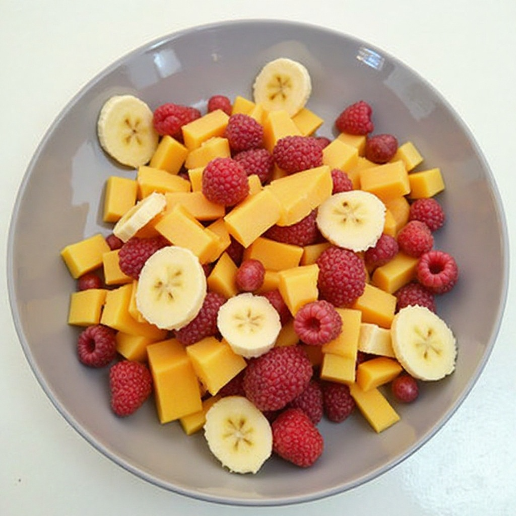 1. En un tazón grande, mezcla las frambuesas, los cubos de piña, mango y plátano maduro. Agrega la nata para montar y asegúrate de que todos los ingredientes estén bien combinados.