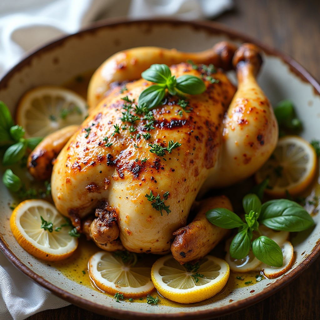 - En un tazón grande, mezcla el jugo de limón, las hojas de tomillo y albahaca, sal y pimienta al gusto. Vierte este mezcla sobre el pollo, asegurándote de que esté completamente cubierto.