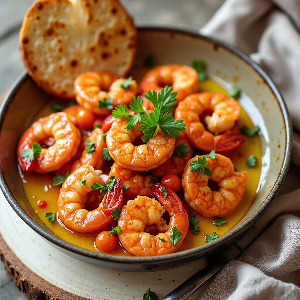 El plato de gambas al ajillo es un manjar de proteínas magras y grasas saludables. La inclusión de pimientos choriceros y paprika de Denia ofrece antioxidantes. Para una versión más saludable, considera usar aceite de oliva con propiedades específicas para la dieta como el aceite de oliva extra virgen, y ajusta la sal según tus necesidades dietéticas.