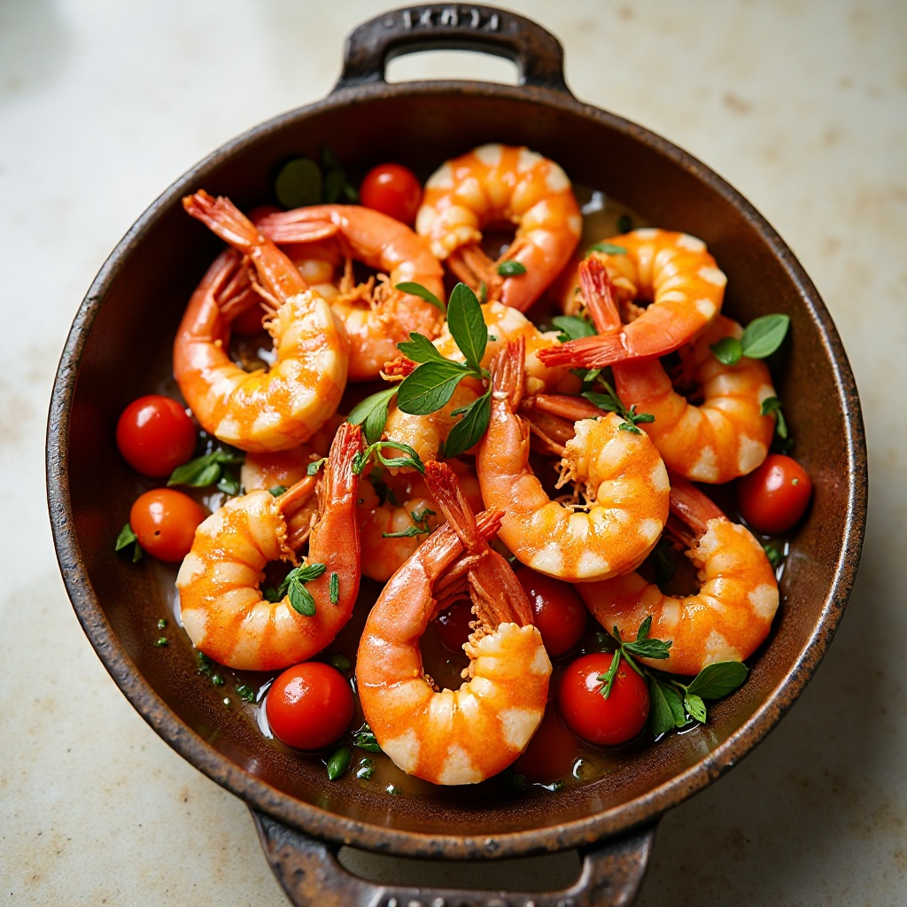 - Una vez cocidas las gambas, retira la hoja de laurel y vierte el contenido de la sartén. Sirve caliente, adornando con hierbas frescas si lo deseas.
