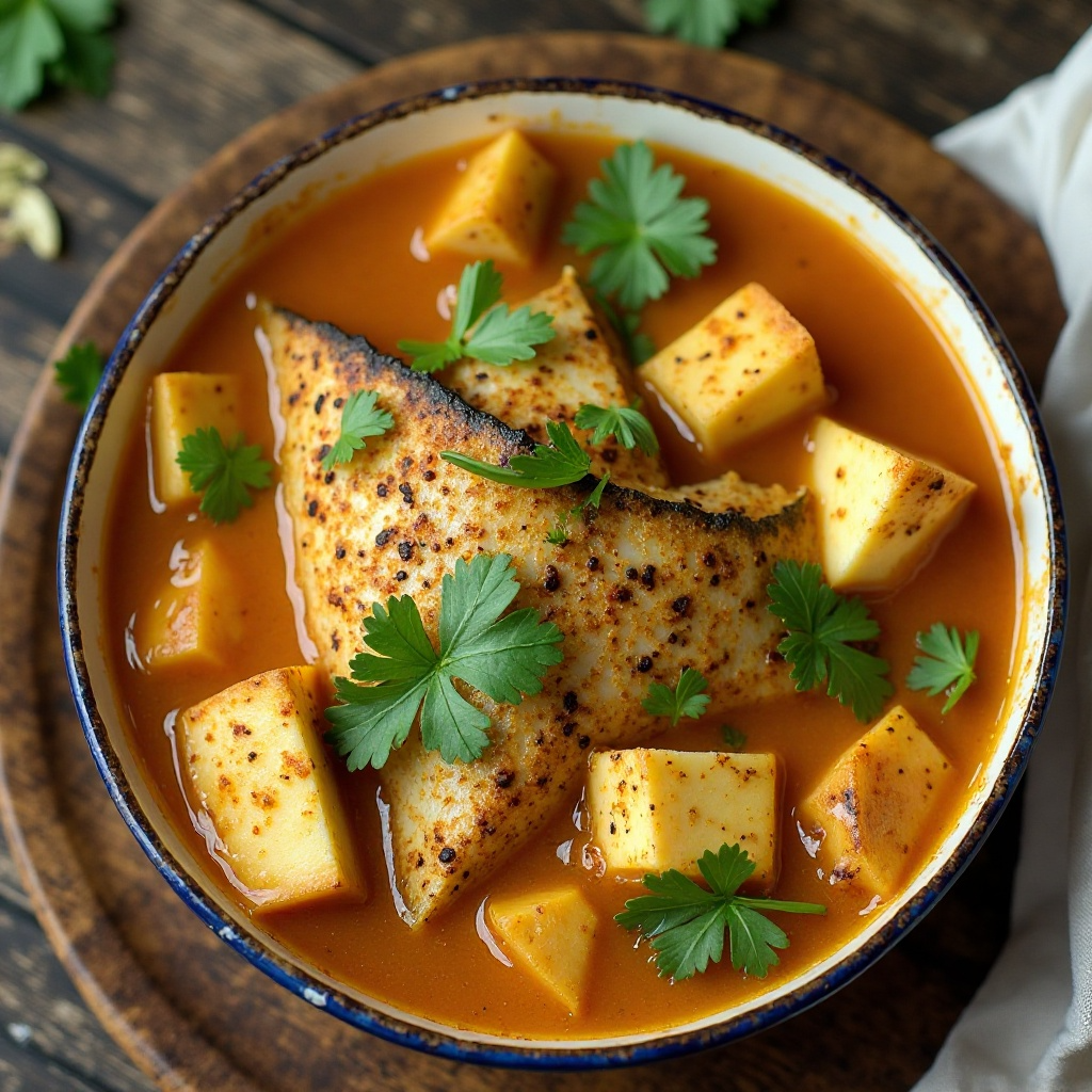 El pescado en esta receta es una fuente importante de proteínas magras y ácidos grasos omega-3, beneficiosos para el corazón y la salud cerebral. Los especia como el comino, cilantro y tomillo no solo realzan el sabor, sino que también aportan propiedades antioxidantes y antiinflamatorias.