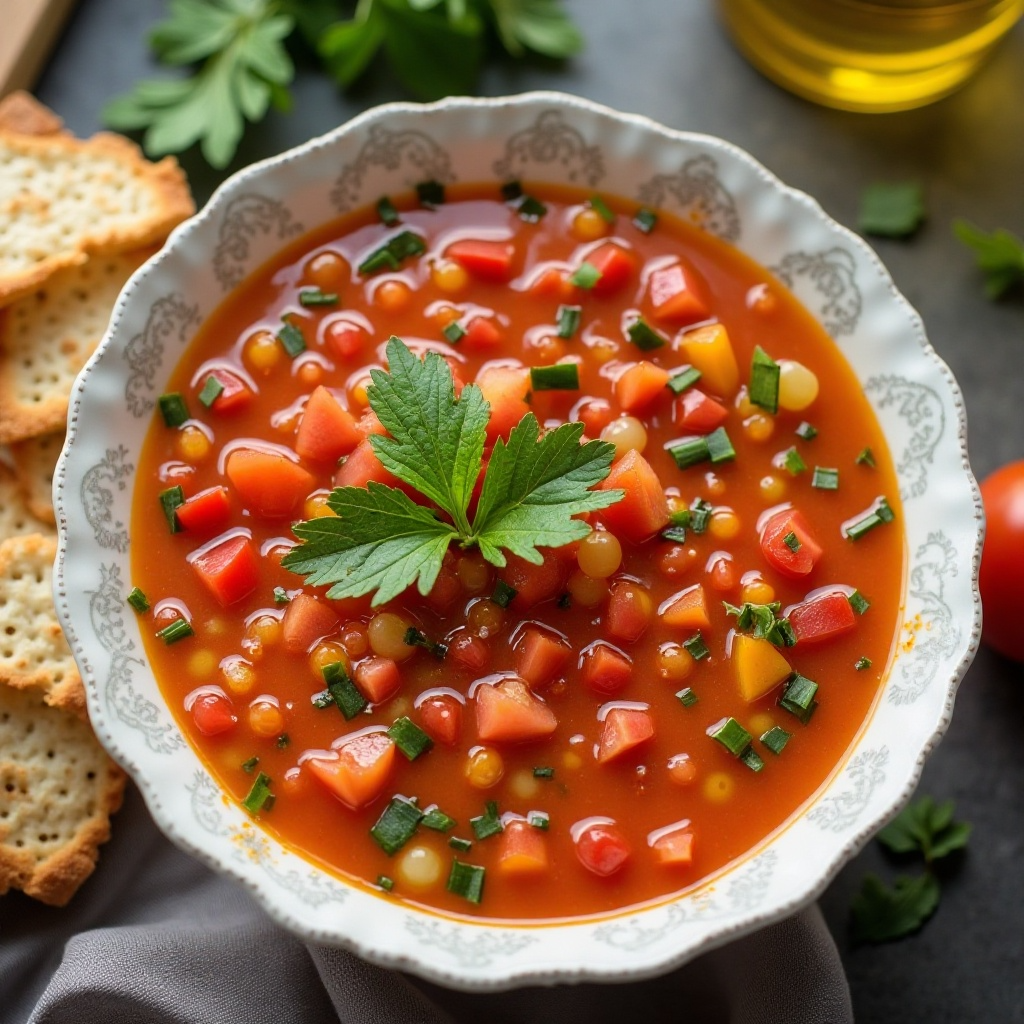 El gazpacho es un clásico plato frío de la cocina andaluza que se caracteriza por su frescura y sabor ácido. Esta versión utiliza aceite de oliva virgen extra, un ingrediente clave en la dieta mediterránea, para realzar sus cualidades saludables y el sabor distintivo del aceite español.