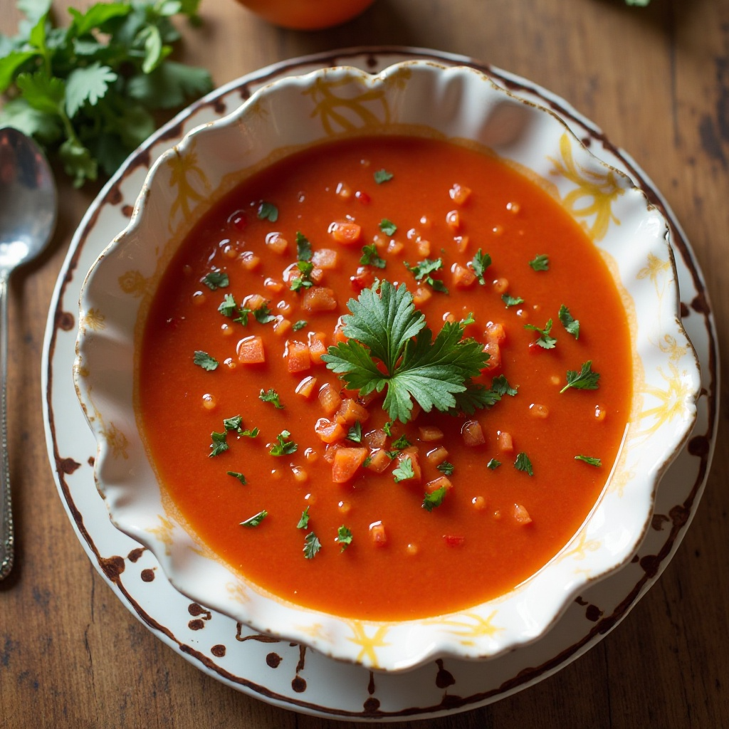 El gazpacho es un plato frío tradicional de Andalucía, España, conocido por su frescura y sabor agridulce. Esta versión utiliza aceite de oliva virgen extra de la región, que realza los sabores de manera distintiva. Ideal para disfrutar en días calurosos, el gazpacho es perfecto como aperitivo o plato principal.