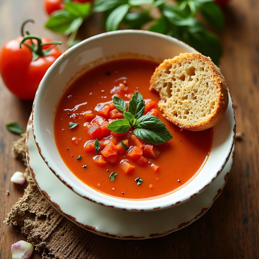 - Sirve el gazpacho en platos individuales y ajusta la sal y pimienta al gusto. Sirve frío y acompaña con pan duro crocante como un toque crujiente adicional.