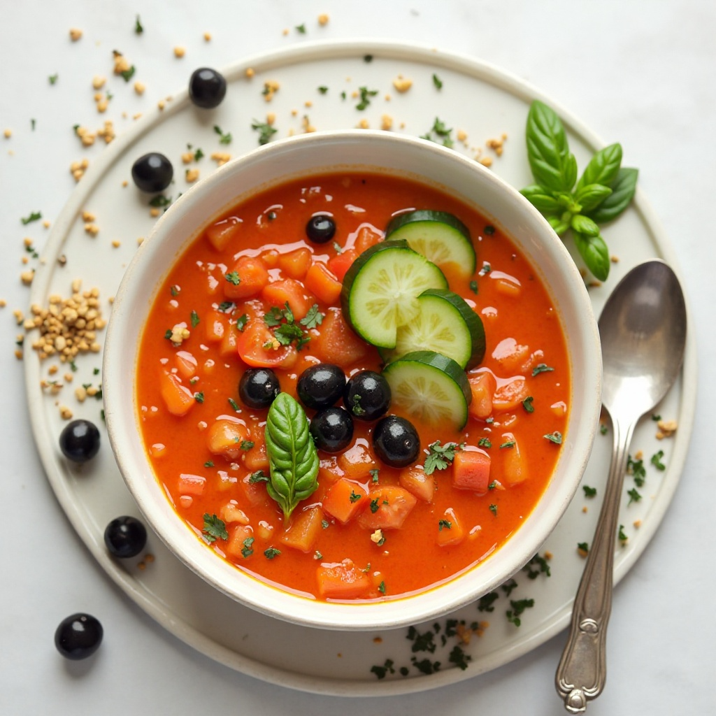 - Sirve en tazones o vasos altos, adornado con aceitunas negras y una rodaja de pepino para un toque decorativo.
