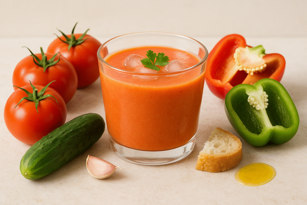 El gazpacho es una fuente rica en antioxidantes gracias a sus ingredientes frescos de tomate y pepino. Contiene fibra, vitamina C y ácido fólico de las verduras, lo que contribuye a mantener una dieta equilibrada. Puedes adaptar la receta reduciendo el aceite de oliva si buscas una versión más ligera.