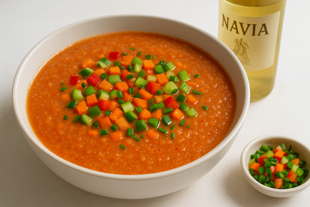 El gazpacho es un refrescante plato de origen andaluz que se ha adaptado en muchas regiones de España, incluyendo Asturias. En esta versión, incorporamos sidra de Navia, una variedad reconocida por su sabor distintivo y aroma afrutado, dando al gazpacho un toque único y asturiano. Esta receta es perfecta para los días de calor y se presenta como una entrada ligera o un plato principal en un menú variado.