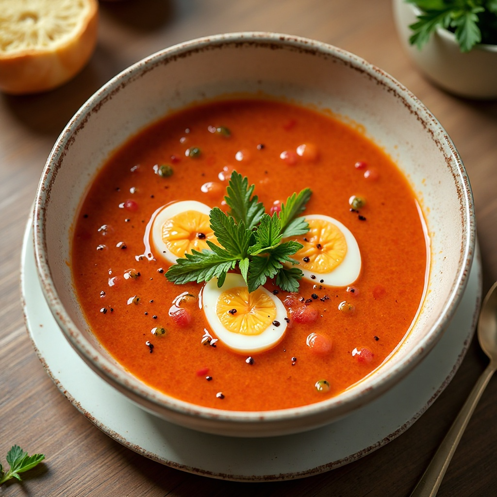 En Córdoba, este gazpacho con toques salmoreros refleja la rica tradición culinaria de Andalucía. El Salmorejo es una sopa fría originaria de Córdoba, que destaca por su textura cremosa y sabor intenso. Al incorporar estos elementos, el plato fusiona dos tradiciones mediterráneas, ofreciendo un plato ligero pero lleno de sabor, característico de la región.