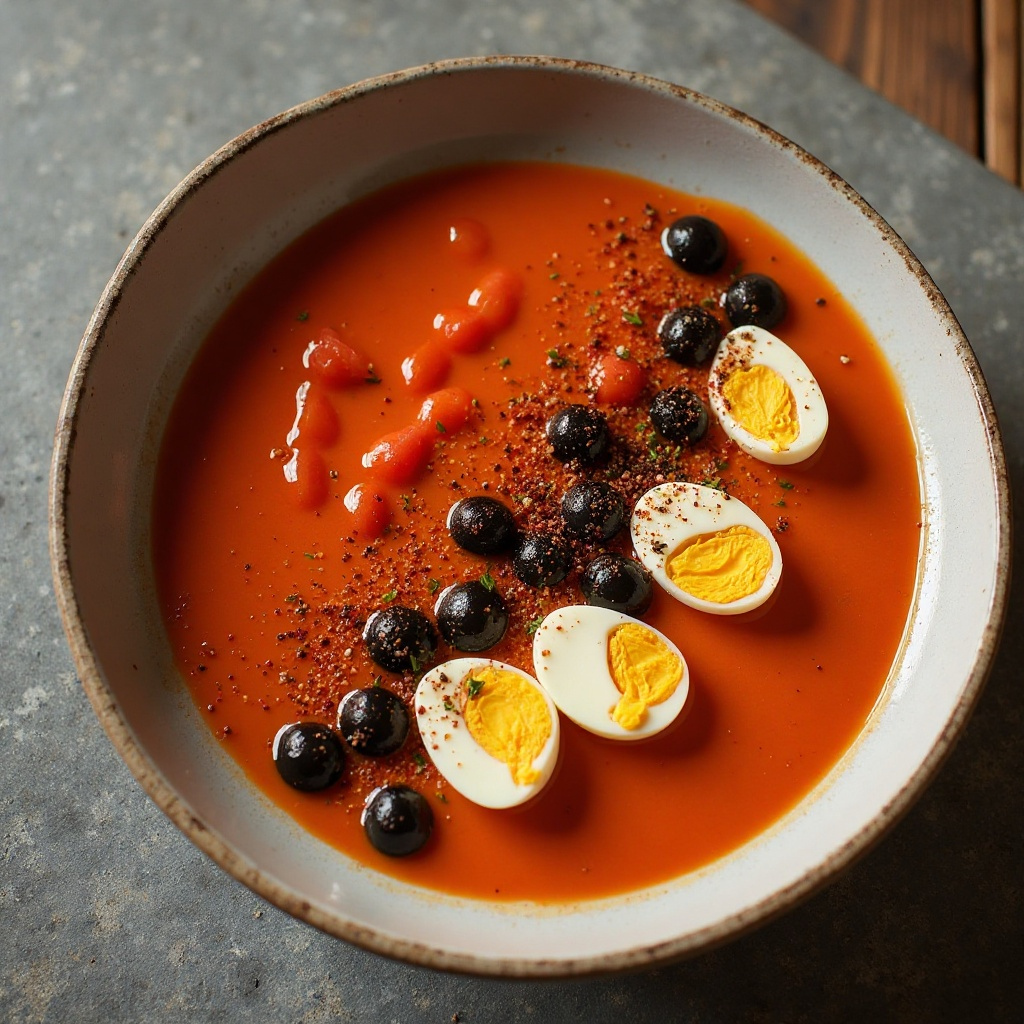 7. Sirve el gazpacho en platos, adornado con huevos duros partidos por la mitad, aceitunas negras y un toque extra de pimentón dulce para realzar el sabor marinero del marmitako.