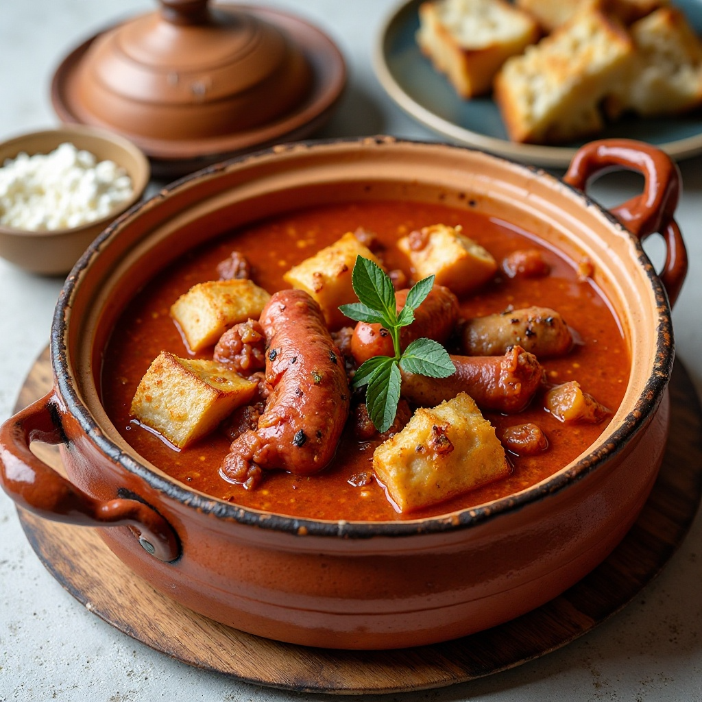 - Cuando las carnes estén tiernas, añade los embutidos reservados y la torta de gazpacho troceada.