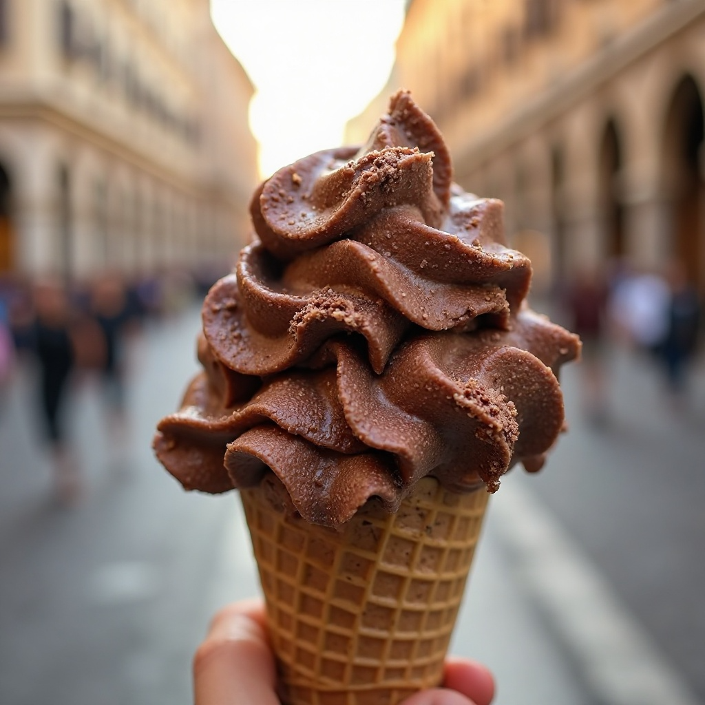 El gelato italiano es una delicia helada, más densa y cremosa que el helado norteamericano. Este gelato de chocolate y almendra es una versión clásica y puede disfrutarse en cualquier momento, incluso imaginando un paseo por las calles históricas de Piazza Navona en Roma.