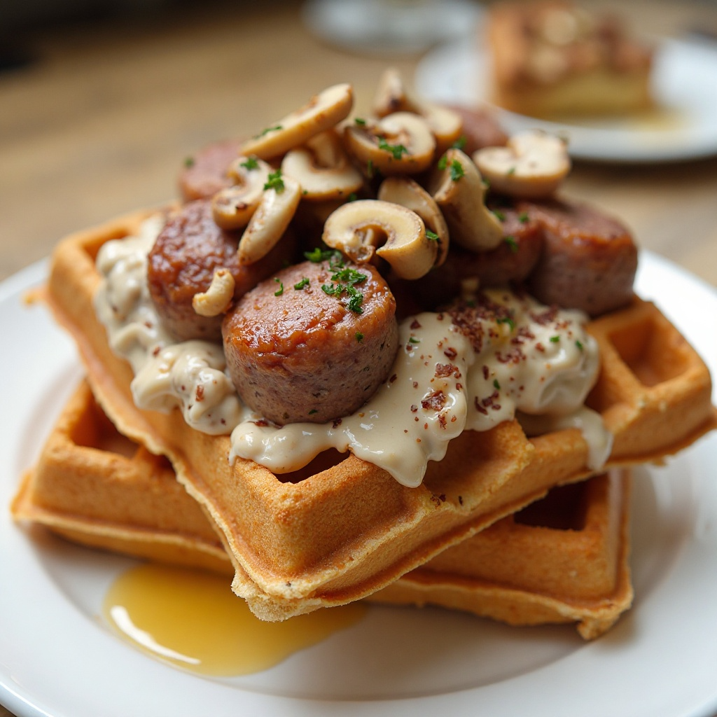 - Montaje: Coloca sobre cada gofre una rodaja de salchicha y cubre con la crema champiñón. Sirve caliente y acompaña con un chorrito de miel si así lo deseas.