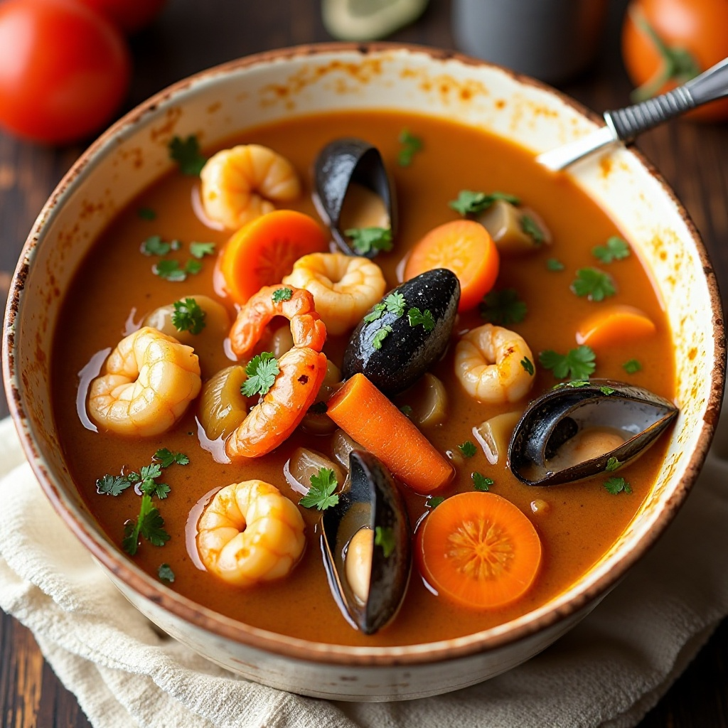 5. Aplasta los mejillones con la parte trasera de un cuchillo para ayudar a liberar su jugo. Añade los camarones, mejillones, langostinos, tomates cherry y zanahorias al caldo, cocinando a fuego medio hasta que los mariscos estén cocidos (aproximadamente 5-7 minutos).