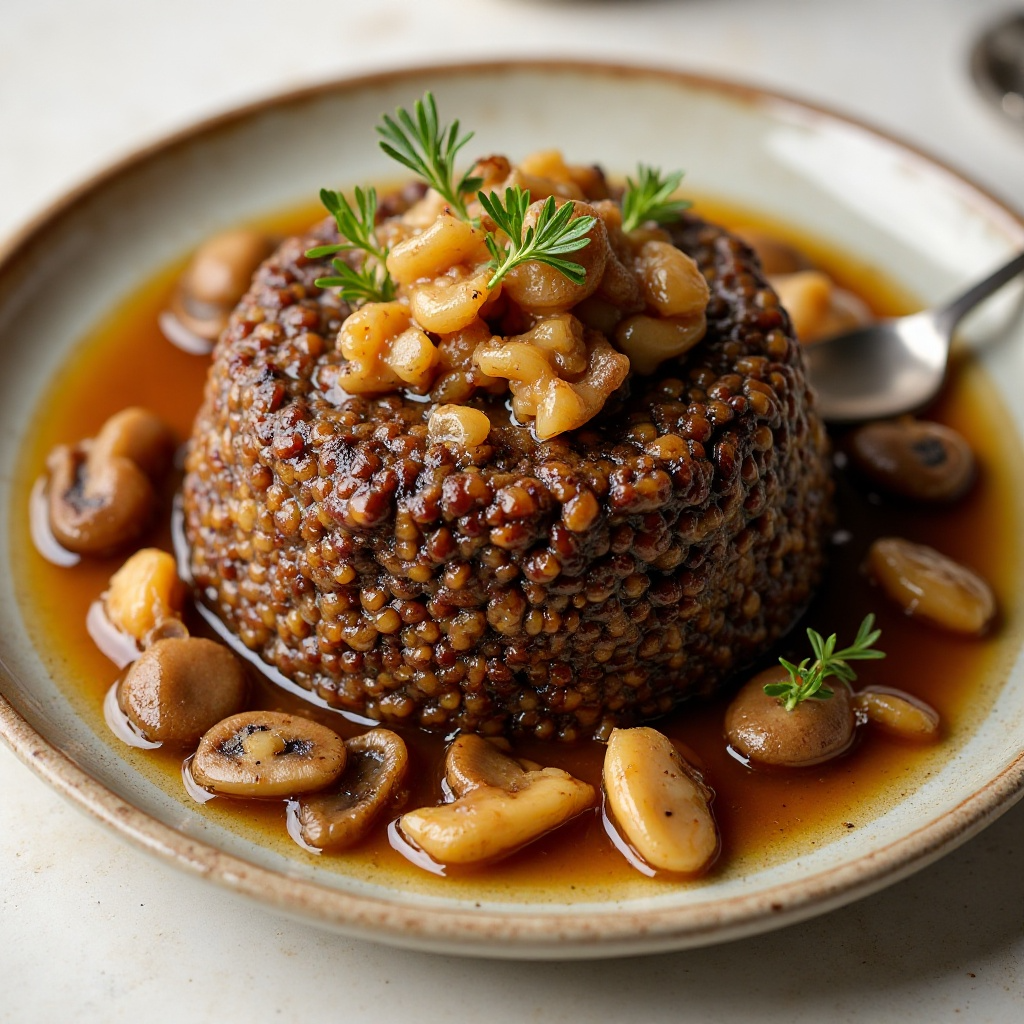 El haggis es un plato tradicional escocés hecho a partir de la mezcla de vísceras y cereales de un cordero, condimentado y cocido en su propia grasa. En Edinburgh, esta receta innovadora incorpora whisky escocés y champiñones para añadir profundidad de sabor y una textura más suave, perfecta para los entusiastas de haggis con un toque moderno.