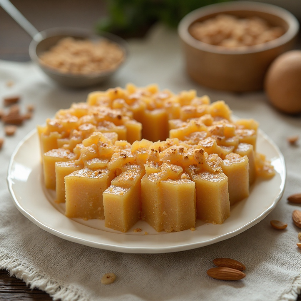 - Transfiere el halwa a un molde o plato para servir. Deja que repose unos minutos para que se enfríe y adquiera consistencia antes de cortar en porciones.