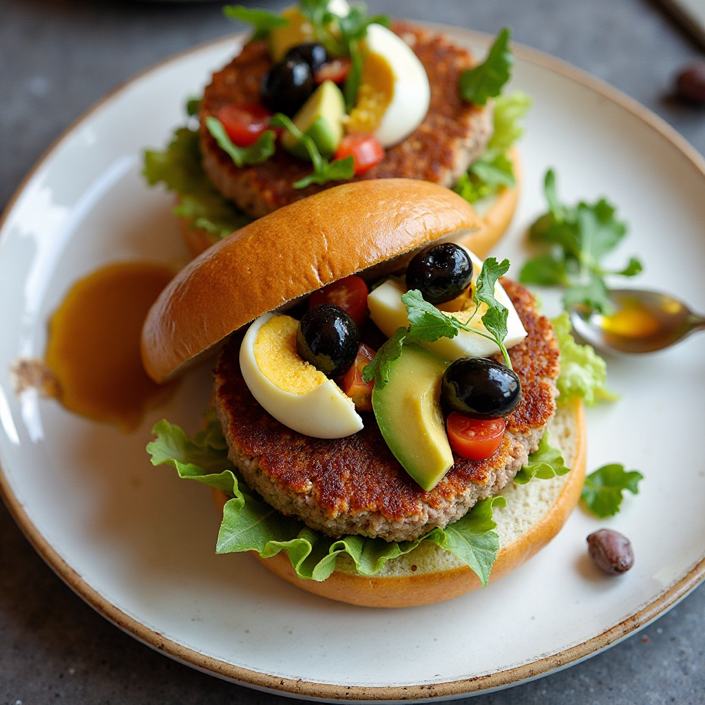 3. Una vez ambas hamburguesas estén listas, coloca cada una sobre un panecillo o pan de hamburguesa preferido, asegúrate de que sea lo suficientemente grande para contener la ensalada niçoise.