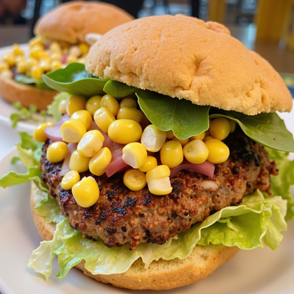 5. Monta las hamburguesas: Coloca una porción de carne de Spiedies sobre una patata crocante, añade un poco de la ensalada de maíz y el aderezo de cebolla/pimiento. Cubre con lechuga romana y sirve calientes.