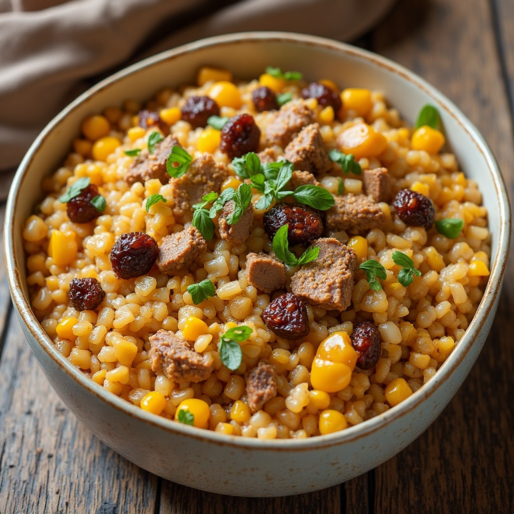 - En un recipiente seguro para hornear, coloca la mezcla de carne con especias en el fondo. Usa una parte del trigo molido para formar un lecho en la superficie de la carne. Cocina a fuego lento hasta que todo esté bien integrado y el trigo esté suavemente cocido.