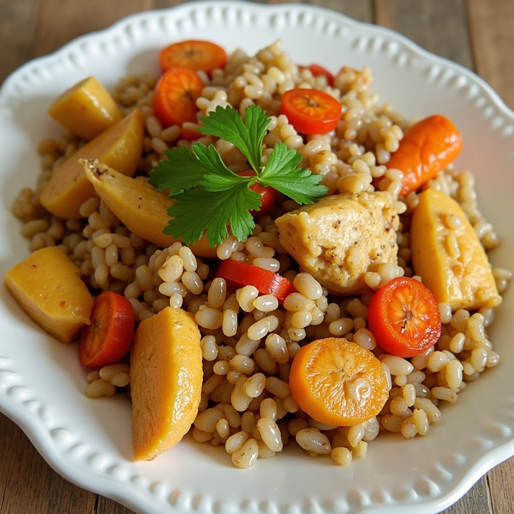 El arroz integral utilizado en esta receta es una opción más saludable que el arroz blanco tradicional, debido a su contenido de fibra y nutrientes complejos. Las verduras proporcionan vitaminas y minerales esenciales, mientras que el pollo es una buena fuente de proteínas magras. Para adaptar esta receta a necesidades dietéticas específicas, se pueden ajustar las cantidades de ingredientes o sustituir el pollo por otras proteínas magras.