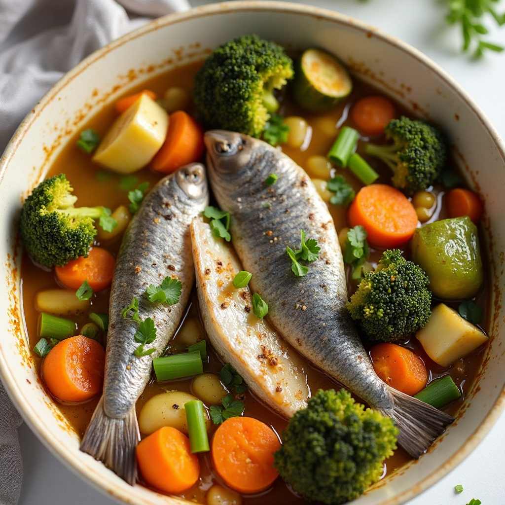 - Añade el haring a la sartén, asegurándote de que todos los trozos estén cubiertos con la mezcla de verduras y líquido. Cocina a fuego medio-bajo por unos 15 minutos o hasta que el pescado esté cocido y suave.