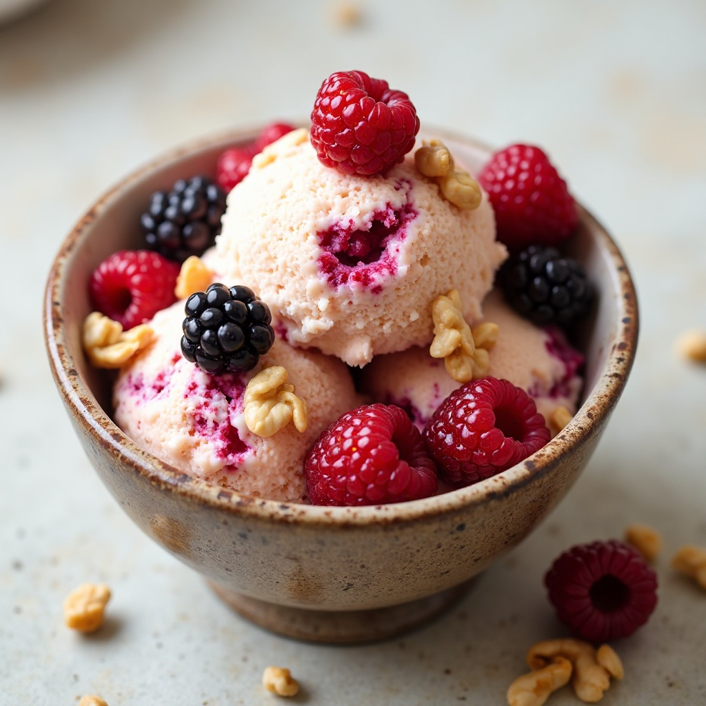 - Una vez listo, añade las frambuesas, moras o fresas y las nueces picadas (si lo deseas) directamente al helado batido. Revuelve suavemente para integrar los ingredientes sin aplastar las frutas.