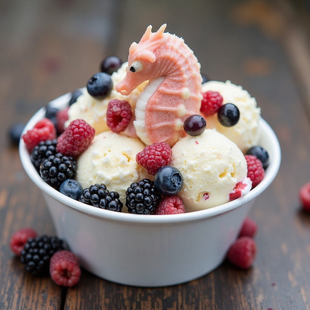 Este helado es una dulce aventura inspirada en los ingredientes frescos y saludables de Cabot’s Dairy. Los caballitos de mar, aunque no son comúnmente asociados con la cocina dulce, se utilizan aquí como un símbolo de sorpresa y descubrimiento. Este helado combina texturas suaves con sabores frescos, todo mientras mantiene un enfoque en los productos locales y sostenibles.