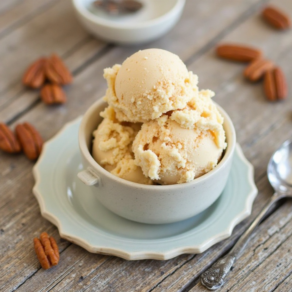 Este helado es naturalmente rico en calorías debido a su contenido de azúcar y mantequilla. Para aquellos con restricciones dietéticas, se puede optar por utilizar edulcorantes más bajos en carbohidratos o reducir la cantidad de mantequilla, aunque esto podría alterar el sabor. Las nueces de pecan aportan fibra y grasas saludables, haciendo este helado una opción relativamente balanceada.