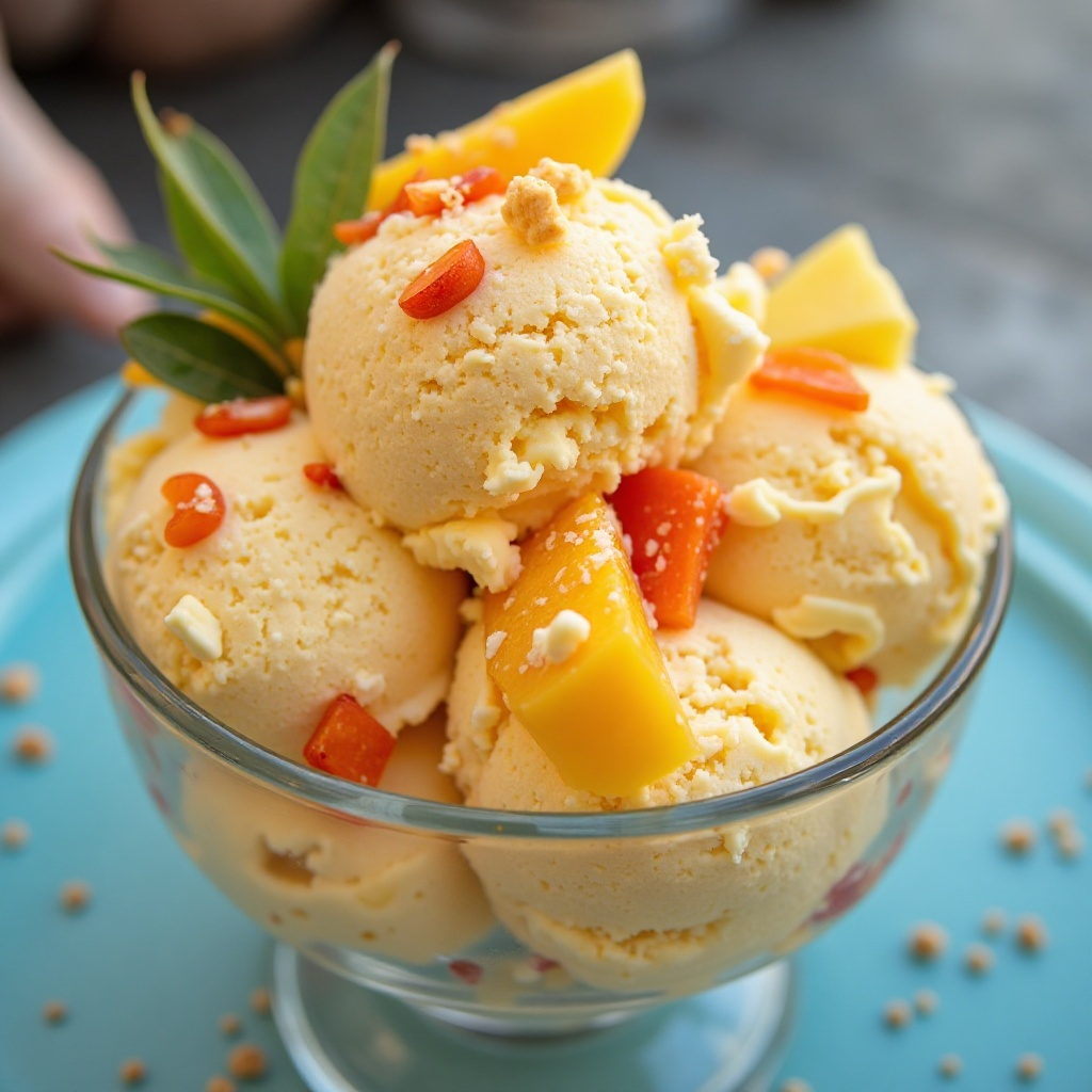 - Sirve el helado artesanal en tazones o conos y decora con trozos adicionales de frutas tropicales frescas, si lo deseas.