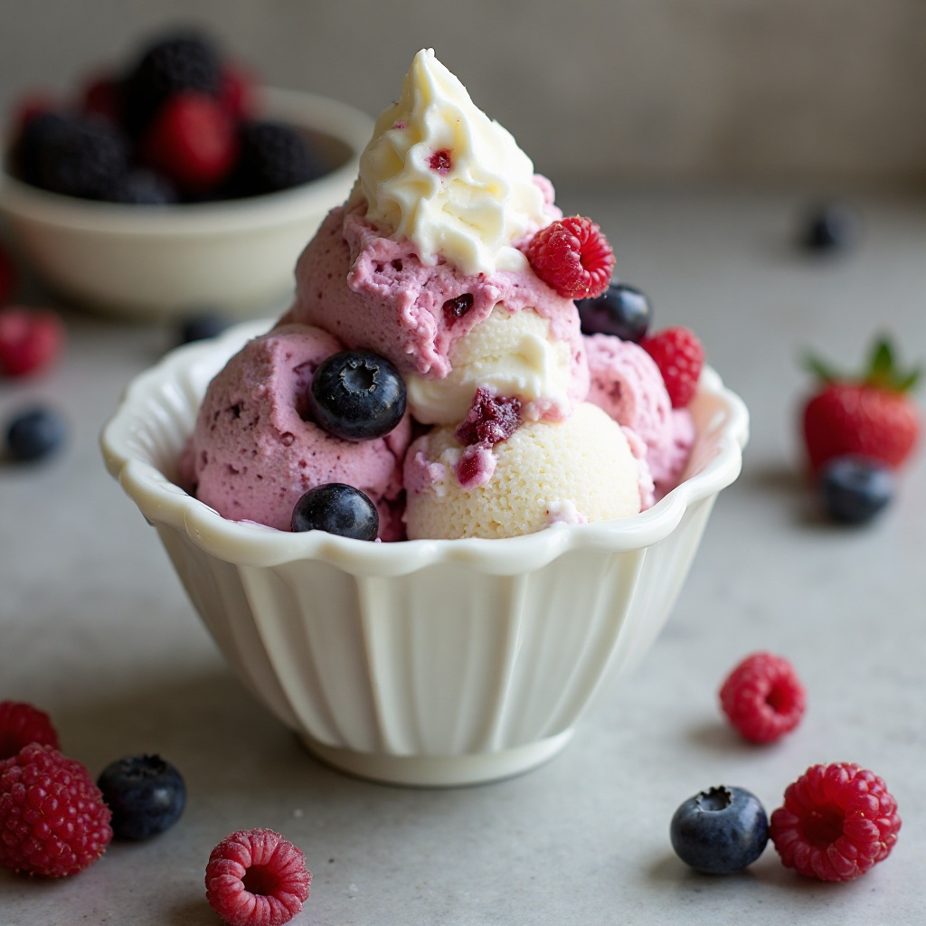 6. Sirve el helado en platos individuales y decora con frutas frescas de Iowa, como bayas de grosella negra, arándanos o frambuesas, para un toque final de color y sabor local.