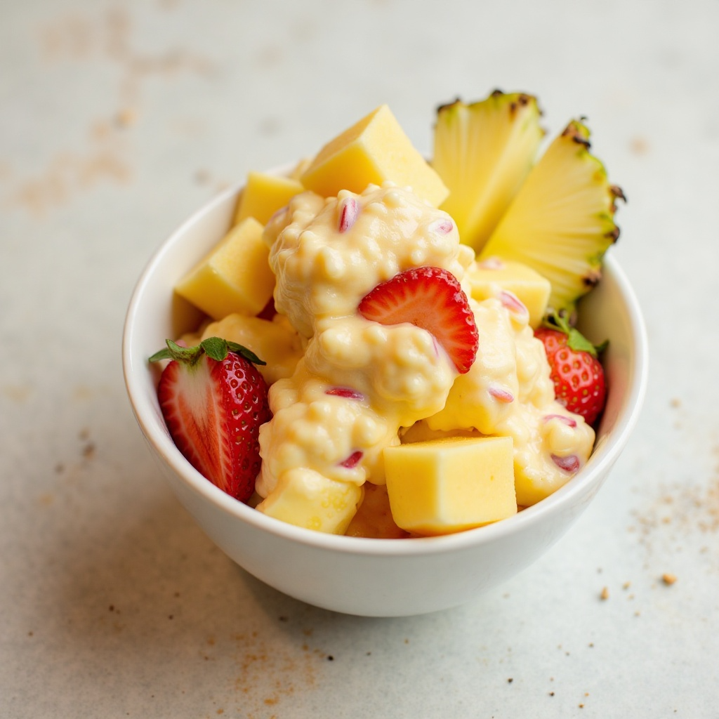 - Añade los cubos de mango y piña a la mezcla y revuelve suavemente.